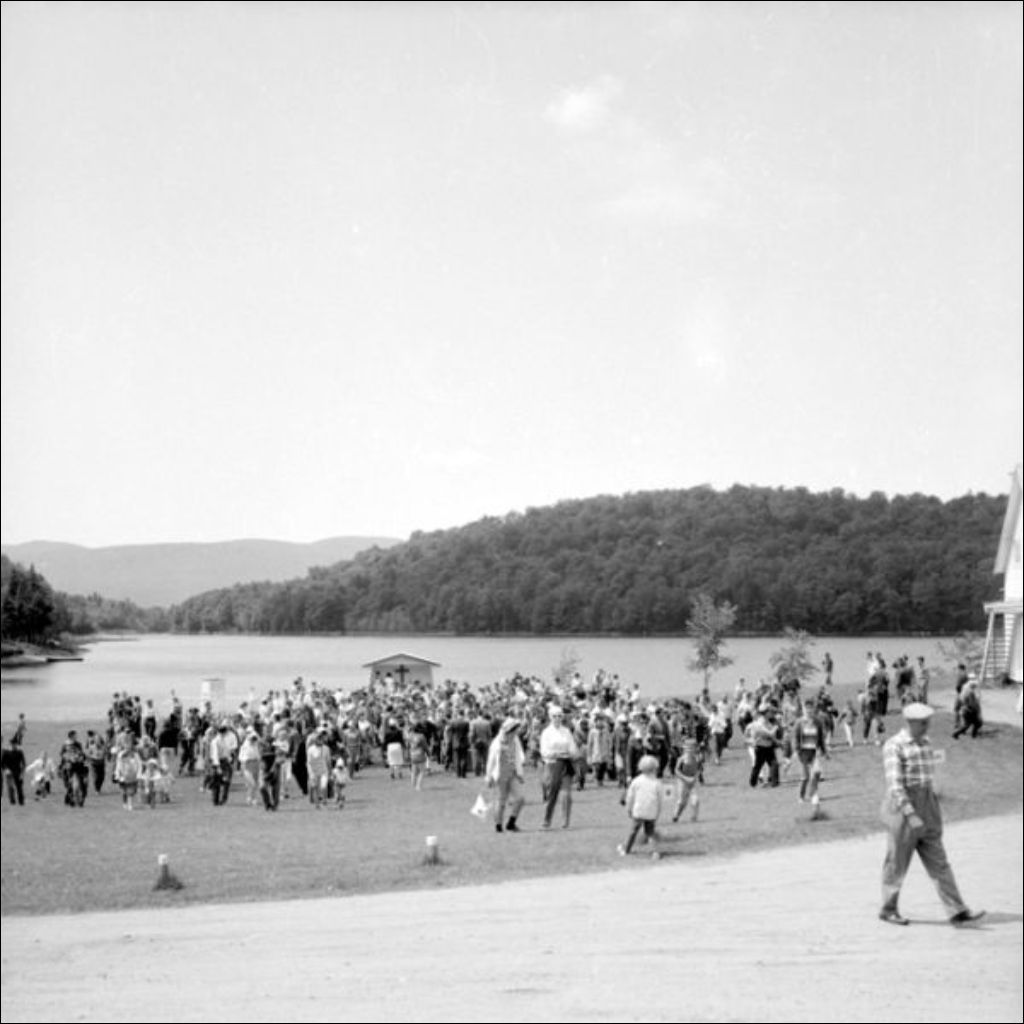 Des mères et leurs bébés profitent du plein air vêtus de maillots de bain. Nous remarquons différentes embarcations servant aux sports nautiques. Des fidèles retournent à leurs voitures à la fin d'une messe célébrée sur la plage. Nous présumons qu'il s'agit du parc du Mont-Tremblant