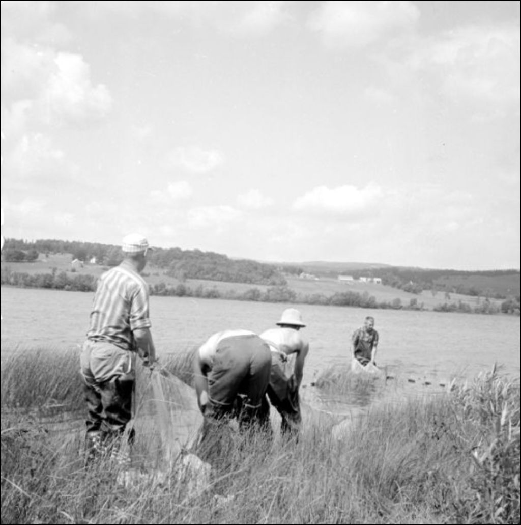 - Au lac à la Truite, l'équipe des Cantons de l'Est représentée par E. Baldwin, R. Châlelain, G. Savard et A. Patterson pratiquent le sennage ( 63-30-1). Parmi les activités s'ajoutent l'étalage et le séchage des sennes en présence de Y. Fournier et J. R. Mongeau (63-30-2). Au camp des biologistes (63-30-3), A. Courtemanche et J.-R. Mongeau posent près du site de camping (63-30-4). Au lac William, au large de la Pointe des Frères, Antonio Barthell de Plessisville exhibe un maskinongé (63-30-7 et 63-30-8)