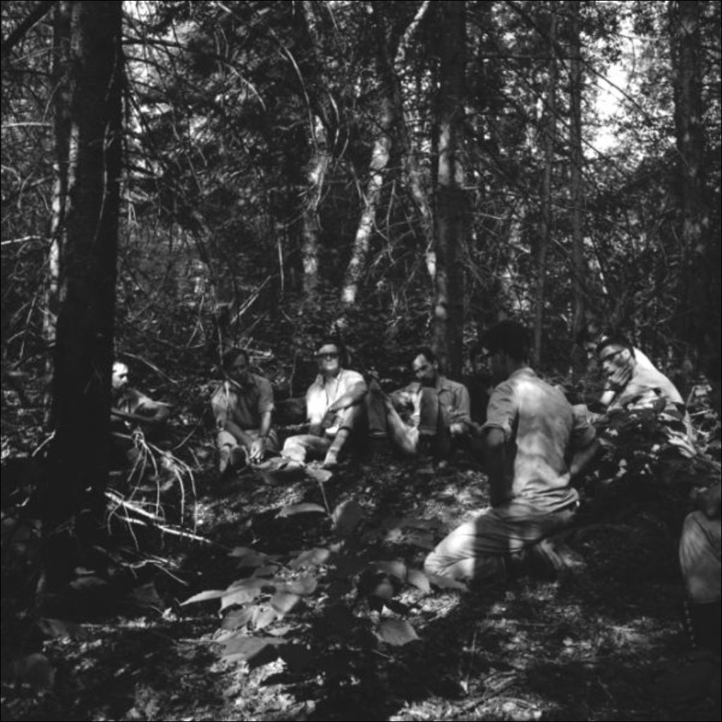 - Réunis dans un boisé, des hommes discutent, prennent des notes et observent la nature