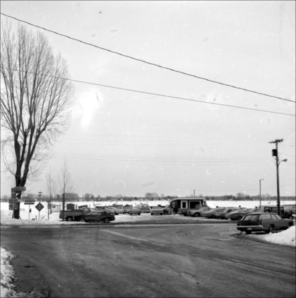 Pêche sur la glace dans la baie Missisquoi, Venise-en-Québec, Montérégie, 1974, Archives nationales à Montréal, Fonds ministère de la Culture et des Communications, (06M,E6,S7,SS2,D74-201), Albert Courtemanche.