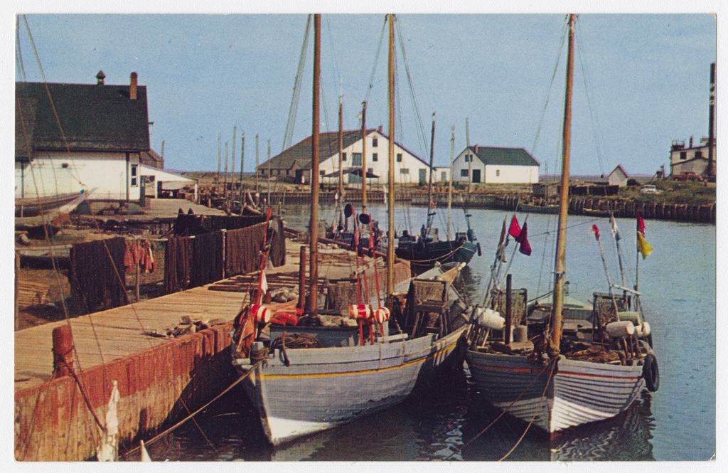 In Scenic Gaspe Peninsula, P.Q : Bâteaux de pêche, l'Anse au Beaufils, P.Q. = In the Scenic Gaspe Peninsula, P.Q :Gaspesian Fish Boats on Bay Chaleur coast, Gaspe Highway, P.Q.