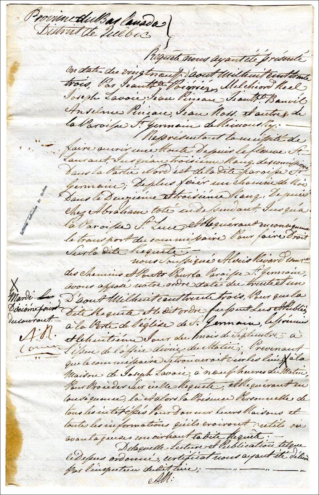 - Procès-verbal au sujet de la route chez J. Lavoie et Pierre Desrochers jusqu'au 3e rang et du chemin de front du 2e et 3e rang