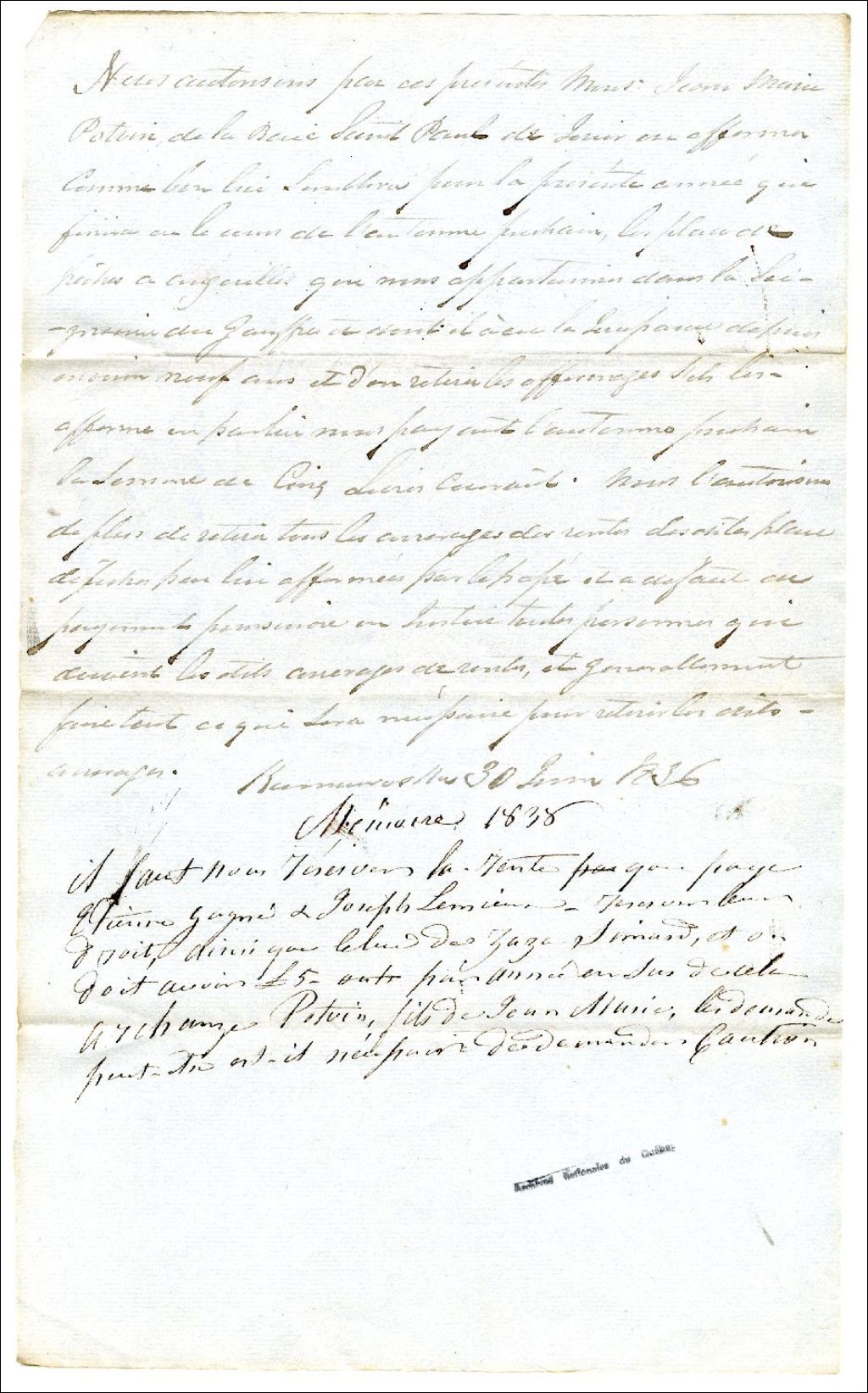 Autorisation à Jean Marie Potvin pour un droit de pêche, 30 juin 1836, Archives nationales à Rimouski, Fonds Famille Tessier, (01R,P1,S10,P129).