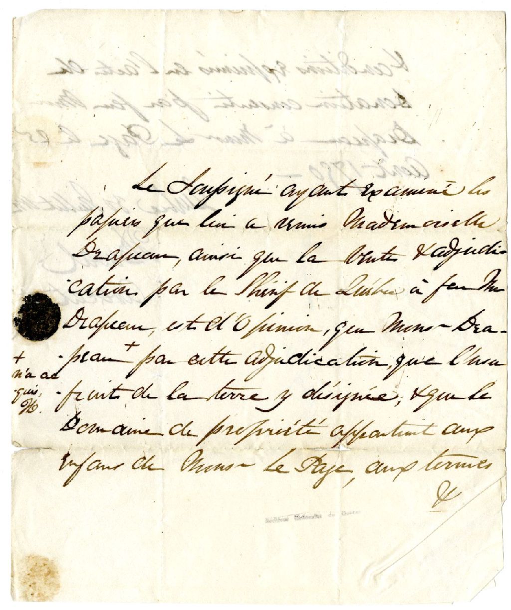 Lettre adressée à Luce-Gertrude Drapeau comportant un avis juridique à propos d'un litige entre les héritiers de Monsieur LePage et de les héritiers de Joseph Drapeau, 30 juillet 1792, Archives nationales à Rimouski, Fonds Famille Tessier, (01R,P1,S10,P33).