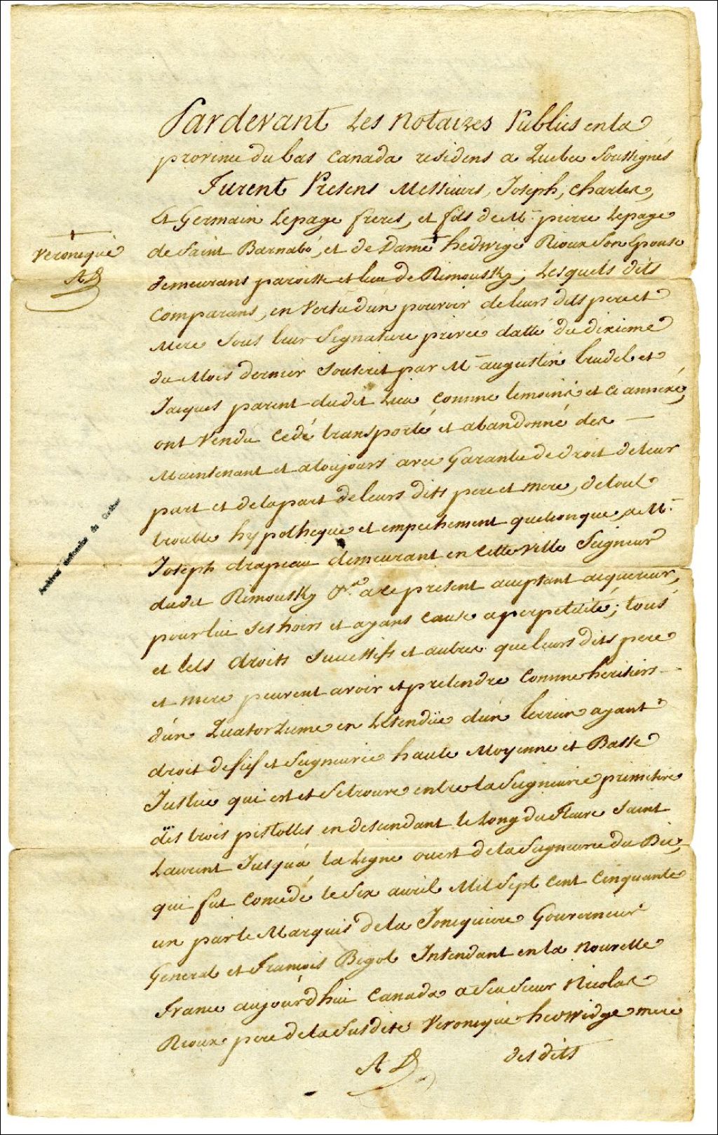 Vente de droits en la seigneurie derrière des Trois-Pistoles par Pierre Lepage de Saint-Barnabé et dame son épouse à Joseph Drapeau, 1 septembre 1792, Archives nationales à Rimouski, Fonds Famille Tessier, (01R,P1,S10,P36).
