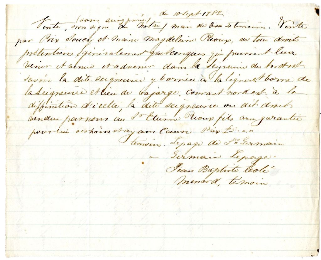 - Vente sous seing privé de parts dans la Seigneurie Nicolas Rioux par P. Soucy et Marie-Madeleine Rioux à Étienne Rioux, fils