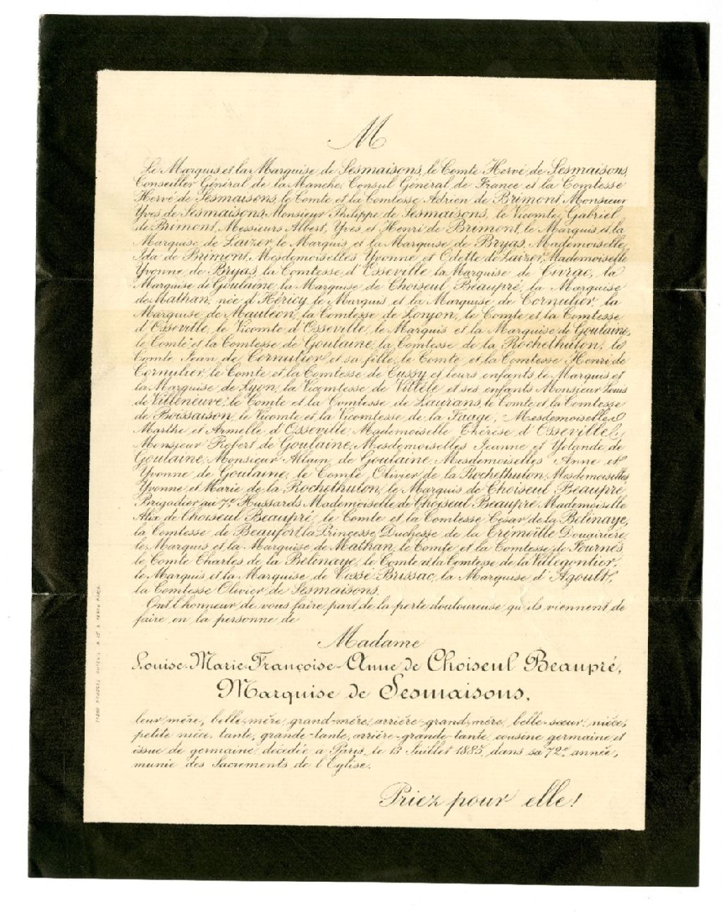Avis de décès de Louise-Marie-Françoise-Anne de Choiseul Beaupré, Marquise de Sesmaisons, septembre 1885, Archives nationales à Rimouski, Fonds Famille Tessier, (01R,P1,S1,SS1,P109).