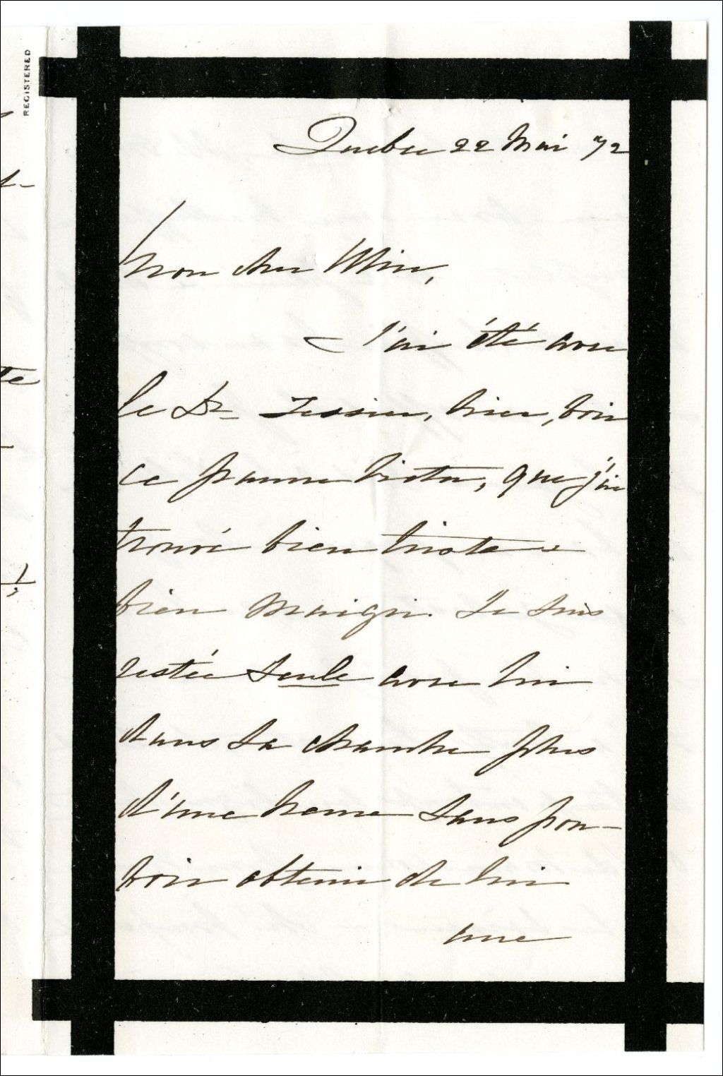 Lettre de Julie [Tessier] à son frère Ulric-Joseph Tessier concernant l'état de santé du Dr Tessier, 22 mai 1872, Archives nationales à Rimouski, Fonds Famille Tessier, (01R,P1,S1,SS1,P61).