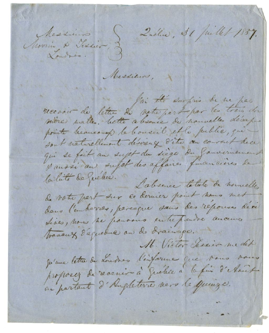 Lettre de Hector L. Langevin à Joseph Morrin et Ulric-Joseph Tessier concernant leur voyage à Londres, 31 juillet 1857, Archives nationales à Rimouski, Fonds Famille Tessier, (01R,P1,S1,SS2,P104).