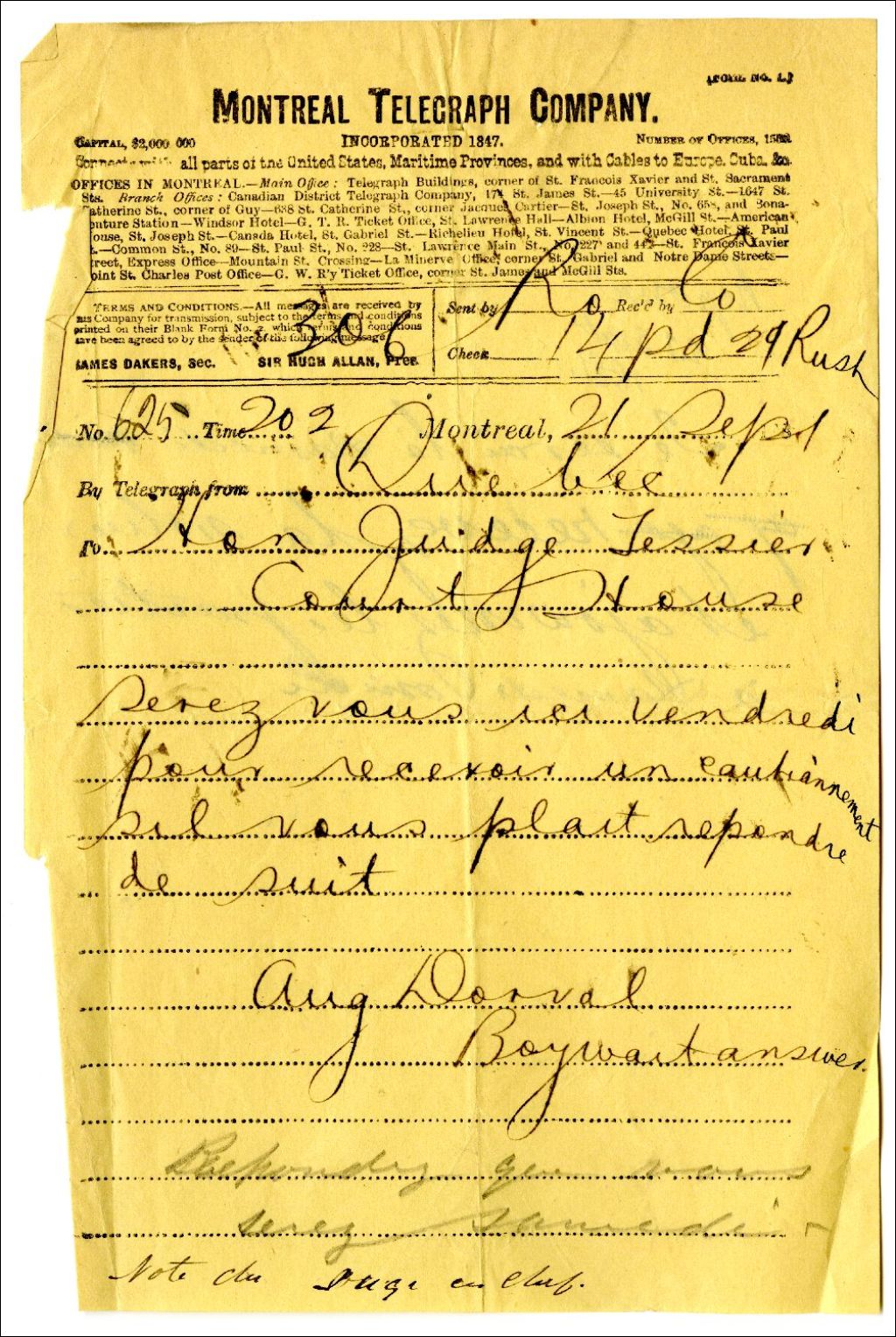 Télégramme de Aug. Dorval à Ulric-Joseph Tessier, 27 septembre 1877, Archives nationales à Rimouski, Fonds Famille Tessier, (01R,P1,S1,SS2,P314).