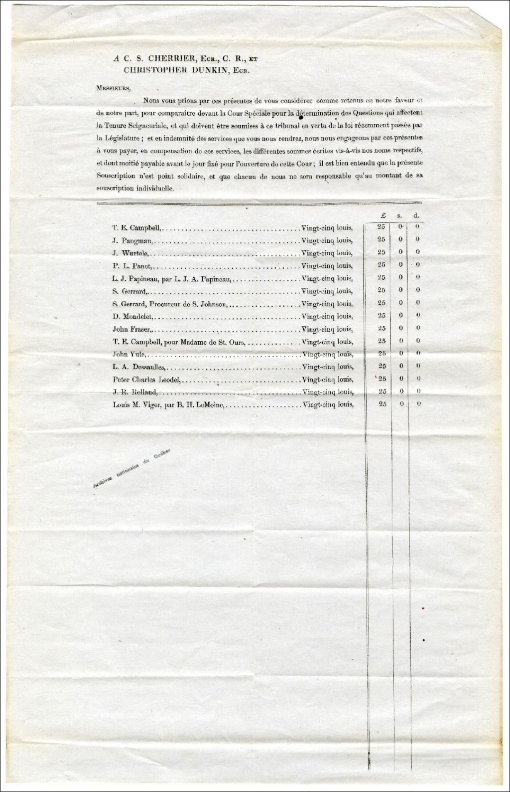 Lettre circulaire à Côme-Séraphin Cherrier et Christopher Dunkin concernant la tenure seigneuriale