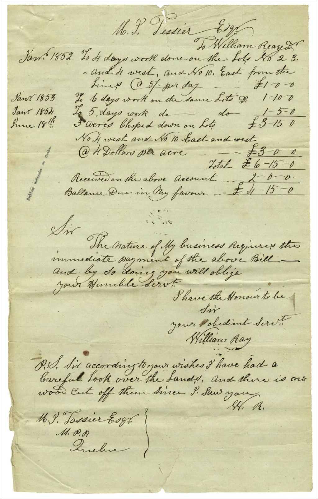 État de comptes de William Ray à Ulric-Joseph Tessier concernant les lots de Kennebec, 19 mars 1856, Archives nationales à Rimouski, Fonds Famille Tessier, (01R,P1,S1,SS2,P98).