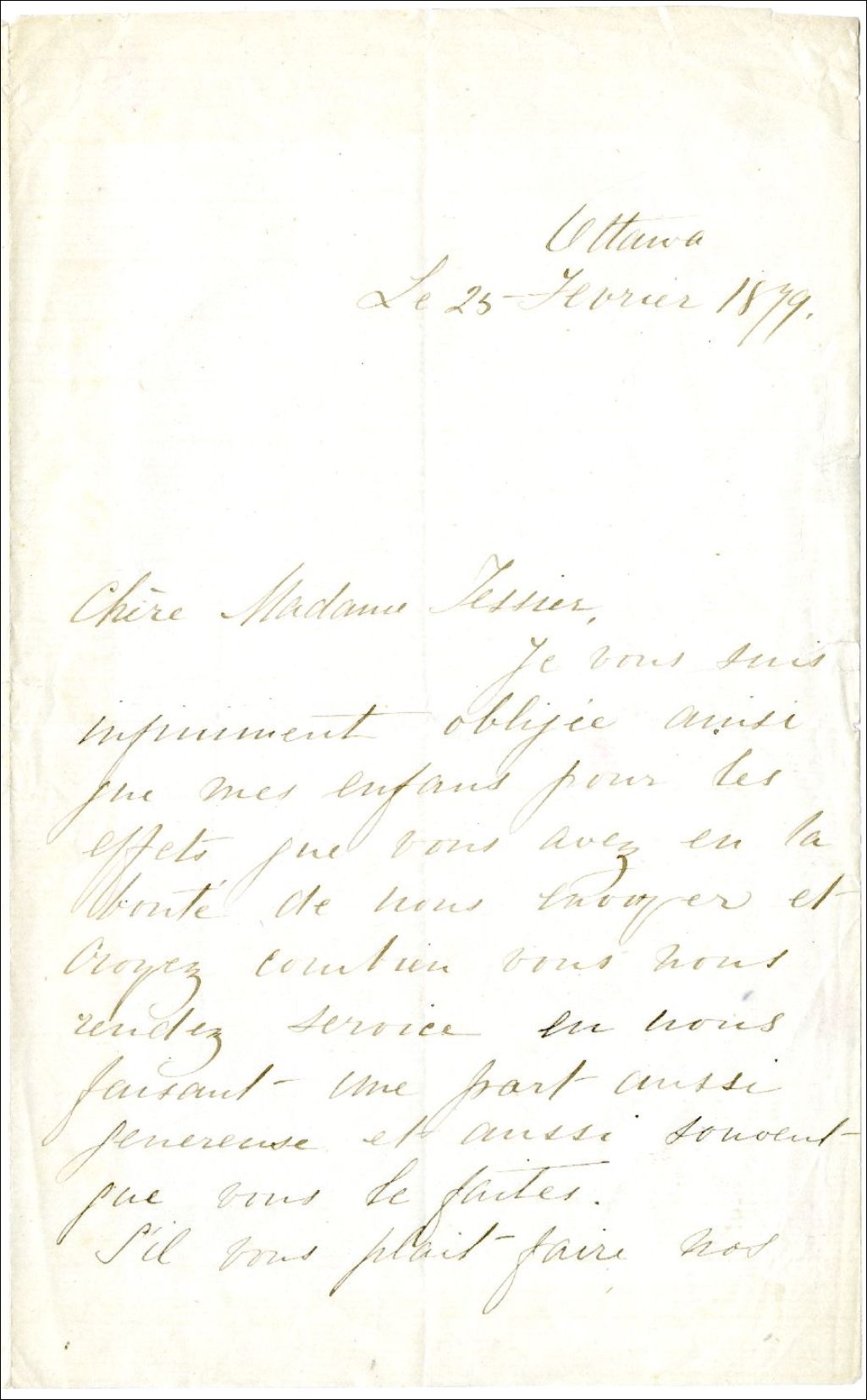 Lettre de Theresa Taché à Maguerite-Adèle Kelly-Tessier, 25 février 1879, Archives nationales à Rimouski, Fonds Famille Tessier, (01R,P1,S2,P52).