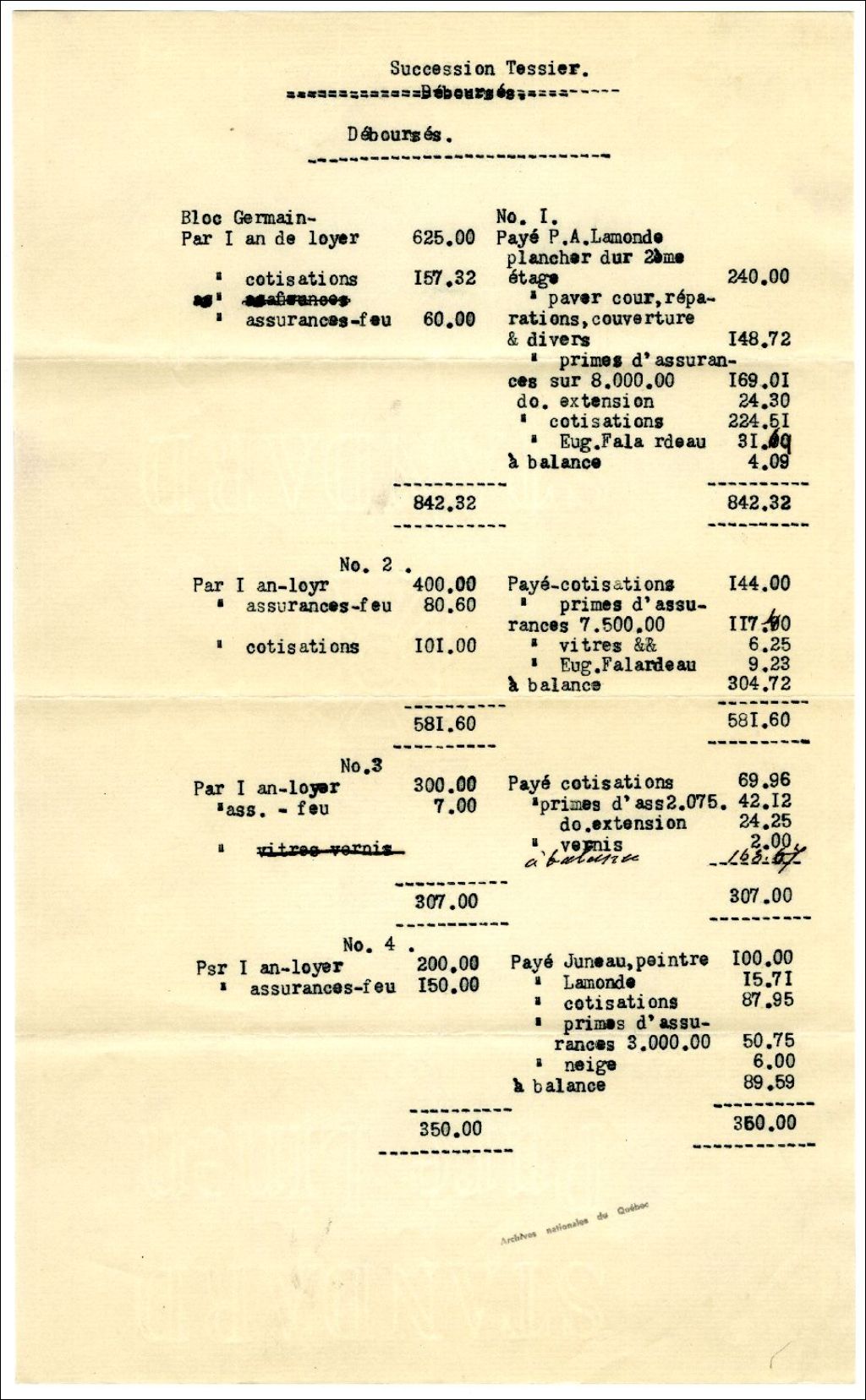 - Déboursés de la succession Ulric-Joseph Tessier