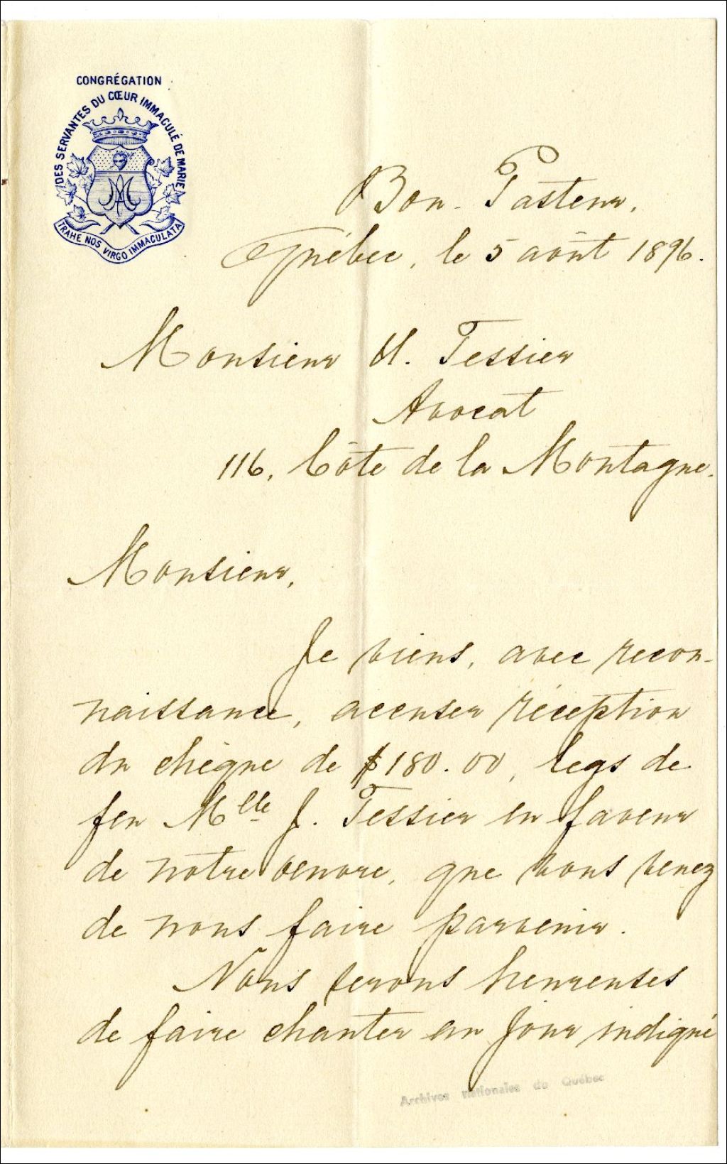 Lettre de Sœur Marie du Carmel des Sœurs du Bon-Pasteur à Ulric Tessier concernant un leg de Julie Tessier, 5 août 1896, Archives nationales à Rimouski, Fonds Famille Tessier, (01R,P1,S3,SS2,P117).