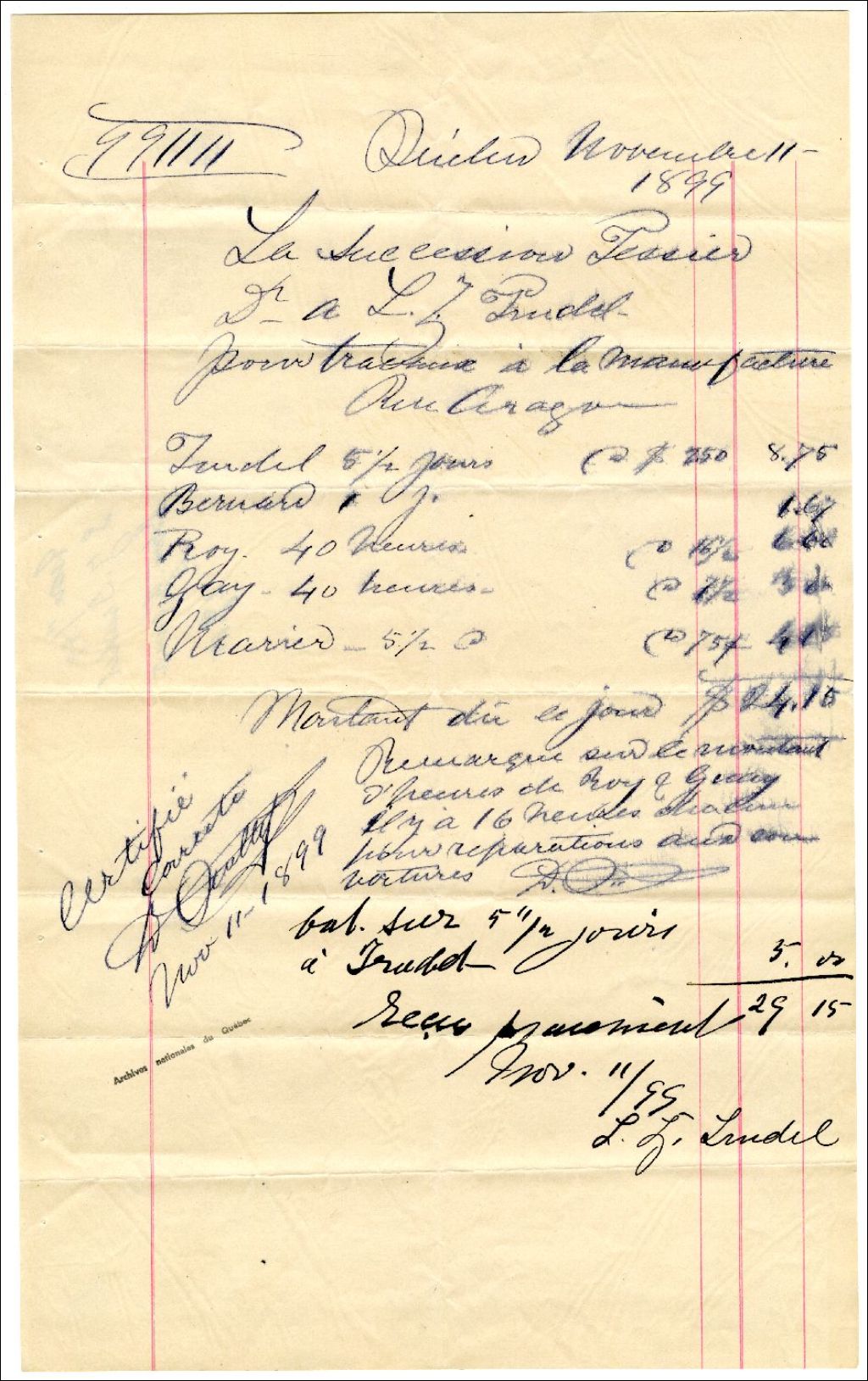 État de compte de L. Z. Trudel, plombier à la succession d'Ulric-Joseph Tessier, 11 novembre 1899, Archives nationales à Rimouski, Fonds Famille Tessier, (01R,P1,S3,SS2,P158).