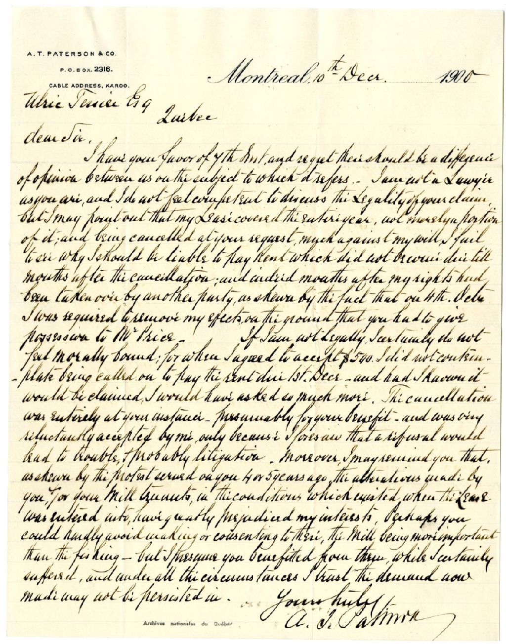 Lettre d'A. T. [Alexander Thomas] Paterson à Ulric Tessier concernant les droits de pêche de la Rivière Rimouski, 10 décembre 1900, Archives nationales à Rimouski, Fonds Famille Tessier, (01R,P1,S3,SS2,P199).