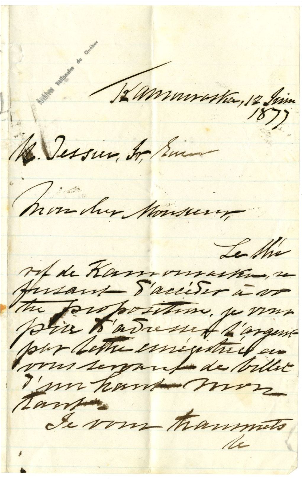 Lettre de Z. Perrault à Ulric-Joseph Tessier concernant un billet de F. Vaillancourt, 12 juin 1877, Archives nationales à Rimouski, Fonds Famille Tessier, (01R,P1,S3,SS2,P21).