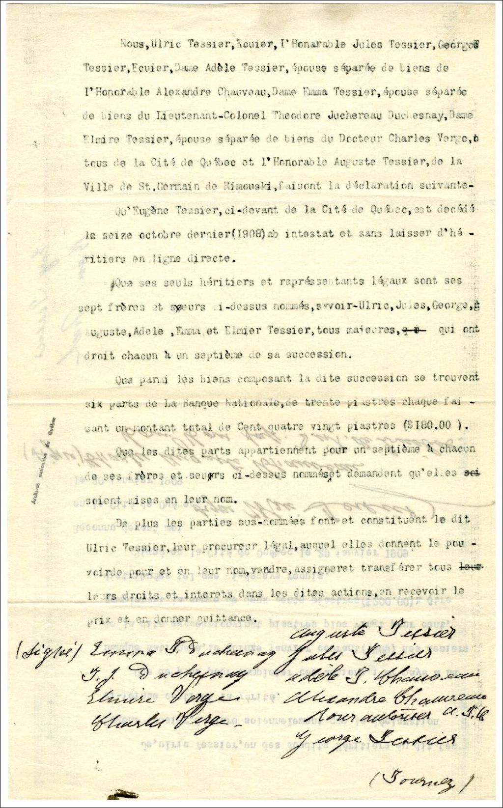 Succession d'Eugène Tessier, 20 janvier 1909, Archives nationales à Rimouski, Fonds Famille Tessier, (01R,P1,S3,SS2,P302).