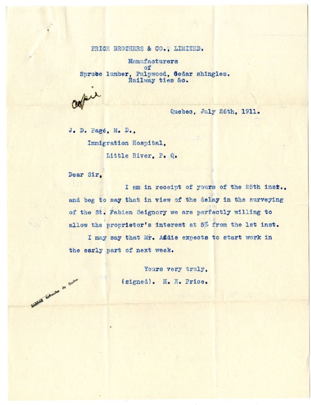 Lettre de H. E. Price à J. D. Pagé concernant Saint-Fabien