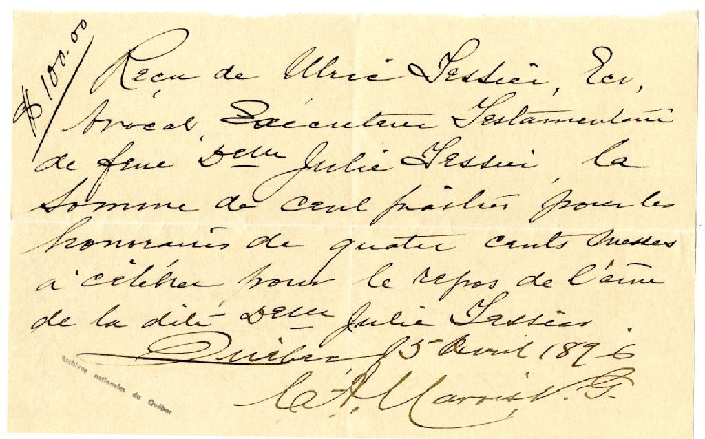 Reçu octroyé à Ulric Tessier pour la célébration des messes pour le repos de l'âme de Julie Tessier, 15 avril 1896, Archives nationales à Rimouski, Fonds Famille Tessier, (01R,P1,S3,SS2,P93).