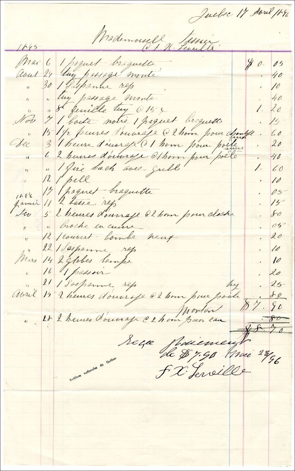 Facture de F. X. Léveiller à Julie Tessier, 17 avril 1896, Archives nationales à Rimouski, Fonds Famille Tessier, (01R,P1,S3,SS2,P98).
