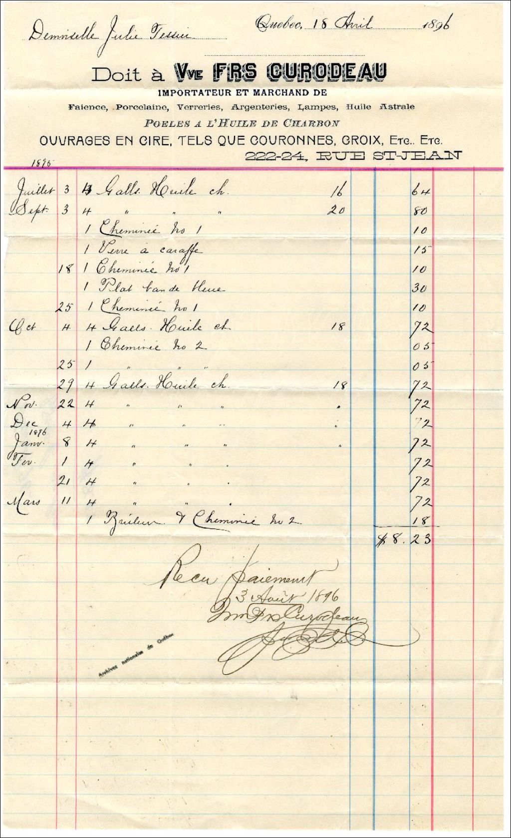 Facture de Frs. Curodeau à Julie Tessier, 18 avril 1896, Archives nationales à Rimouski, Fonds Famille Tessier, (01R,P1,S3,SS2,P99).