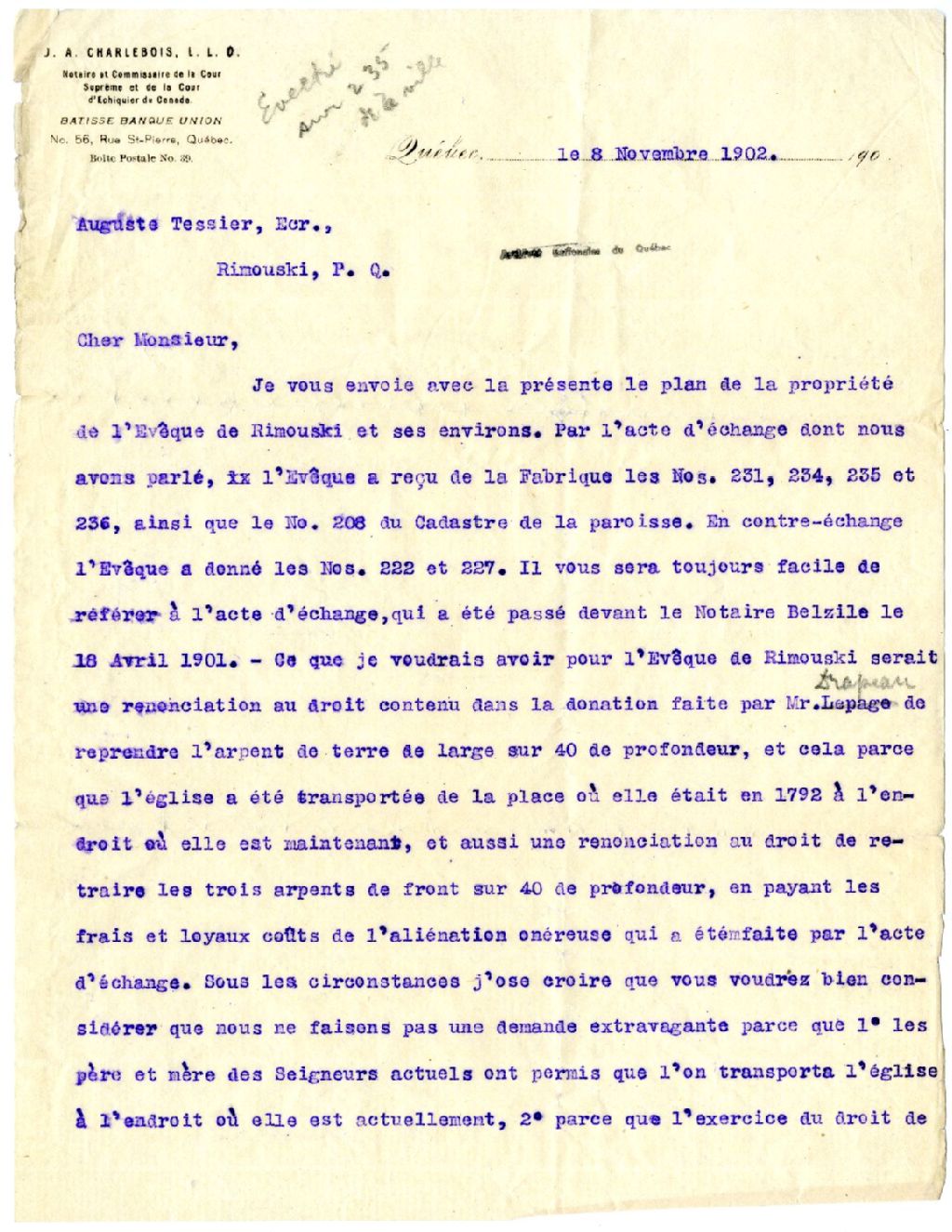Lettre de J. A. Charlebois à Auguste Tessier concernant un échange de terre avec l'évêque de Rimouski, 8 novembre 1902, Archives nationales à Rimouski, Fonds Famille Tessier, (01R,P1,S4,P10).