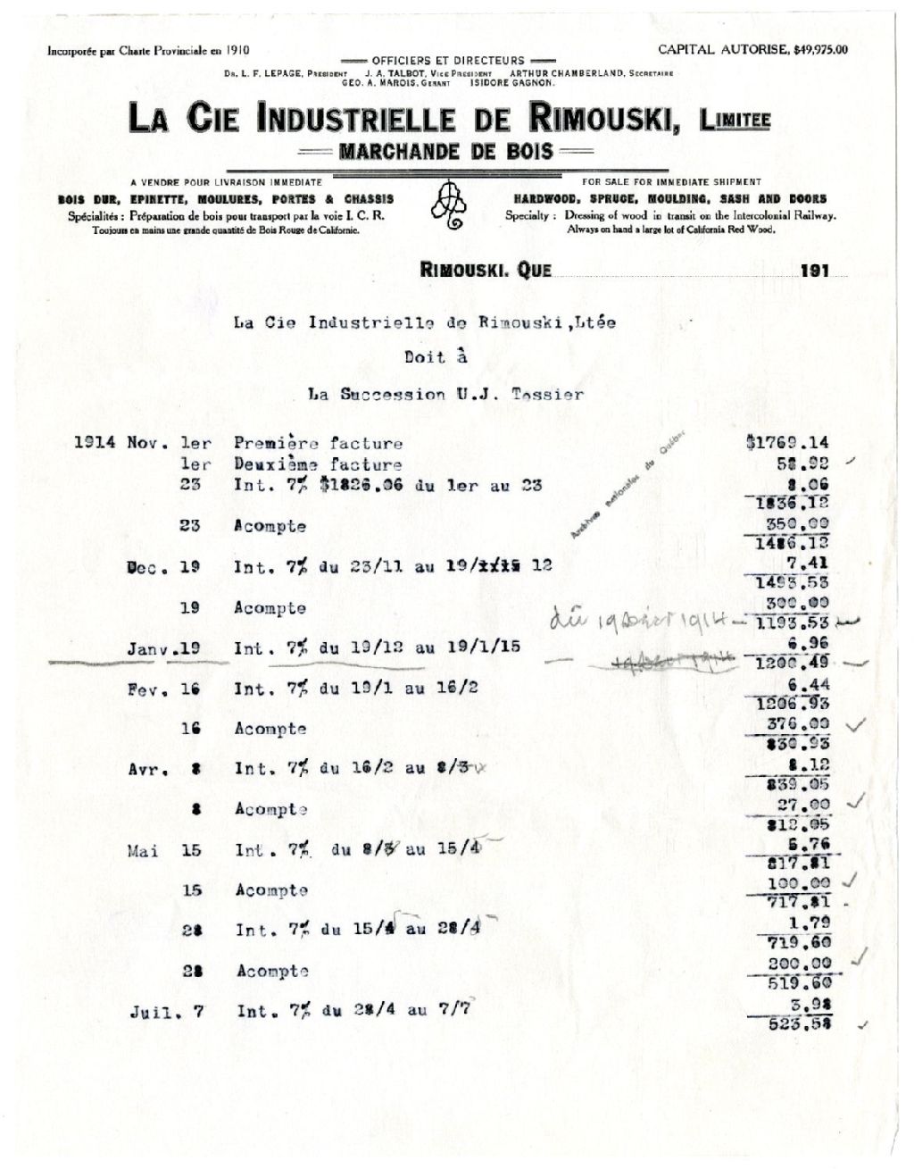 État de compte de La Cie Industrielle de Rimouski, Limitée avec la succession Ulric-Joseph Tessier, 1914-1915, Archives nationales à Rimouski, Fonds Famille Tessier, (01R,P1,S4,P14).
