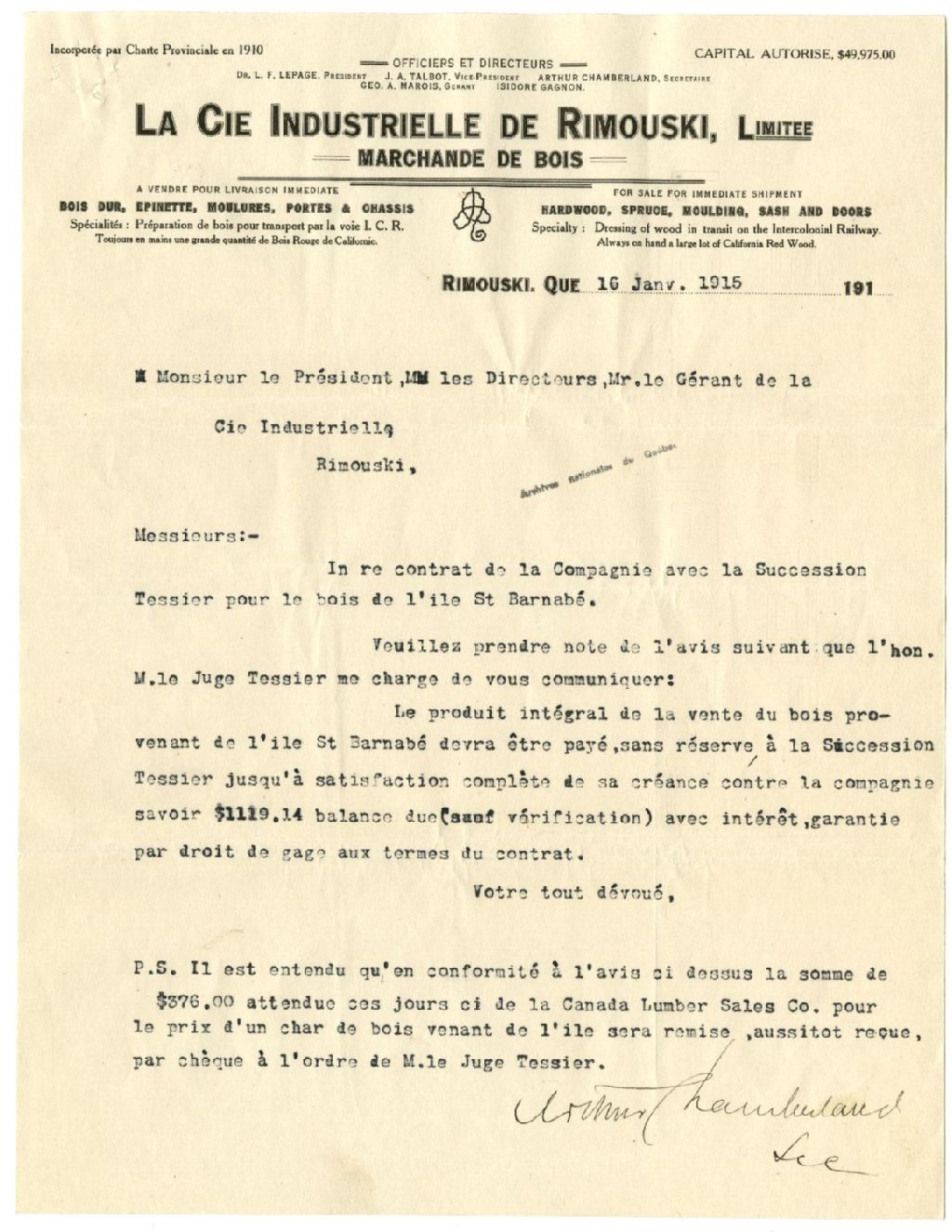 Lettre d'Arthur Chamberland de La Cie Industrielle de Rimouski, Limitée à [Auguste] Tessier concernant la coupe de bois sur l'Île Saint-Barnabé