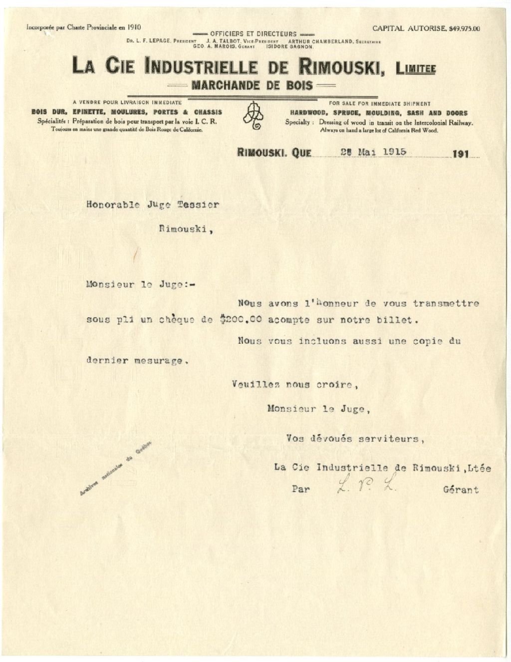 Lettre de La Cie Industrielle de Rimouski, Limitée à [Auguste] Tessier concernant la coupe de bois sur l'Île Saint-Barnabé