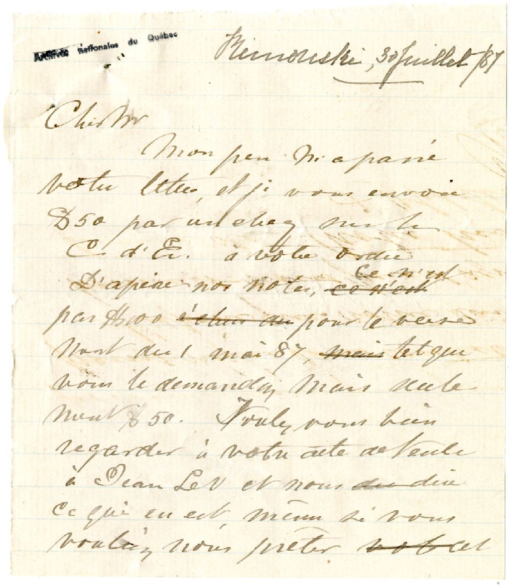 Lettre d'Auguste Tessier concernant l'acte de vente de la terre de Jean Levasseur, 30 juillet 1887, Archives nationales à Rimouski, Fonds Famille Tessier, (01R,P1,S4,P4).