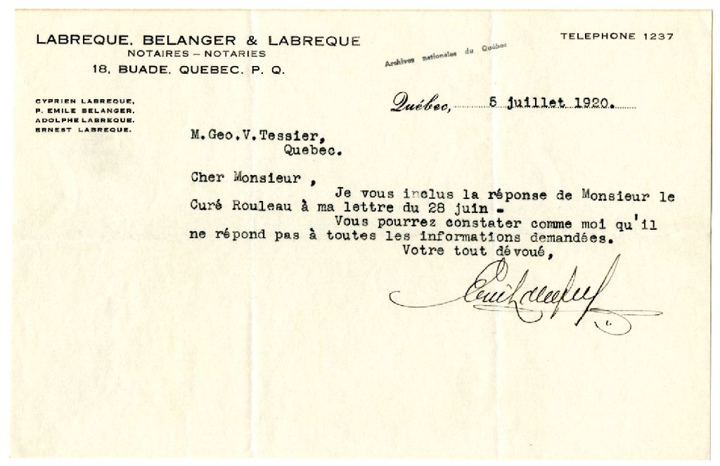 Lettre du notaire Labrèque à Georges-Victor Tessier au sujet de la lettre du curé Albert Rouleau