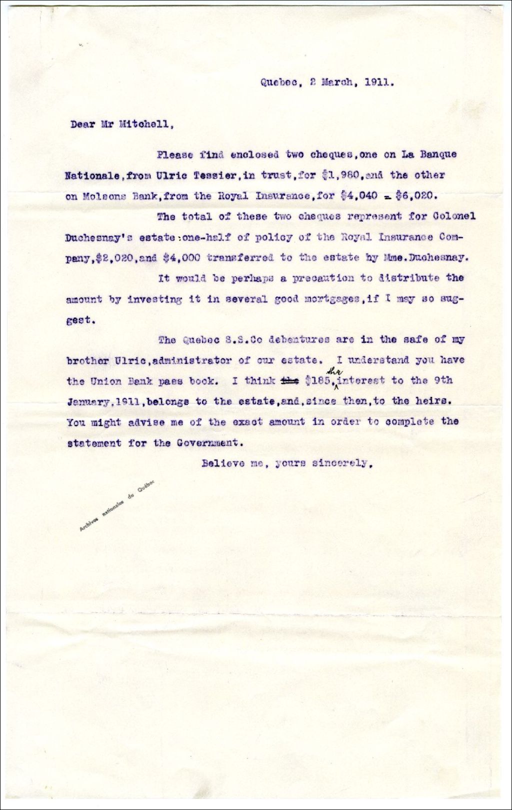 Lettre de Georges-Victor Tessier à James M. Mitchel concernant la succession d'Henri-Théodore Juchereau Duchesnay, 2 mars 1911, Archives nationales à Rimouski, Fonds Famille Tessier, (01R,P1,S7,P15).