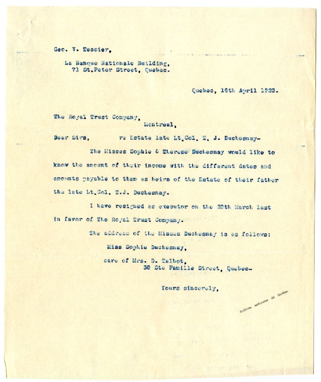 Lettre de Georges-Victor Tessier à la Royal Trust Company concernant la succession d'Henri-Théodore Juchereau Duchesnay