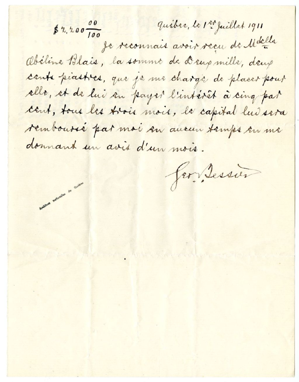 Reçu de Georges-Victor Tessier à Obéline Blais avec le détail des paiements, 1 juillet 1911, Archives nationales à Rimouski, Fonds Famille Tessier, (01R,P1,S7,P22).