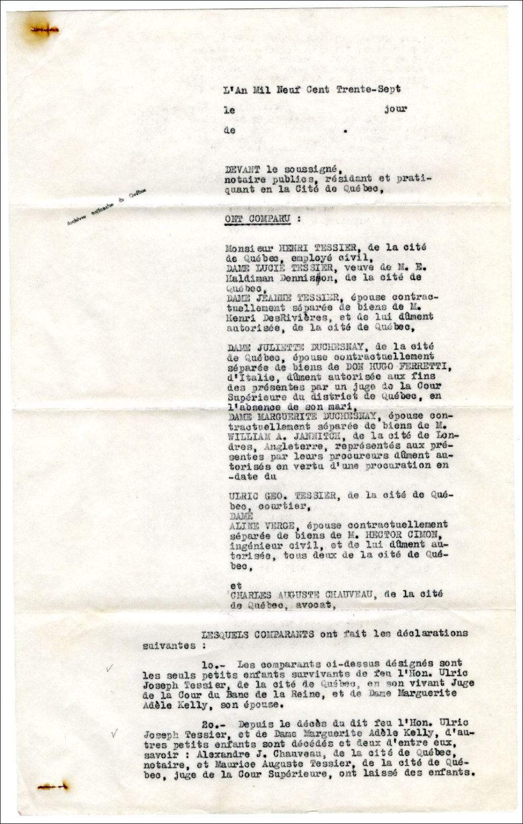 - Convention entre Henri Tessier, Lucie Tessier, Jeanne Tessier, Ulric-Georges Tessier, Juliette Duschesnay, Marguerite Duschesnay, Aline Verge et Charles-Auguste Chauveau