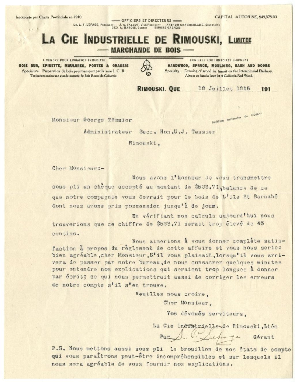 Lettre de La Cie Industrielle de Rimouski, Limitée à Georges [Victor] Tessier concernant la coupe de bois sur l'Île Saint-Barnabé