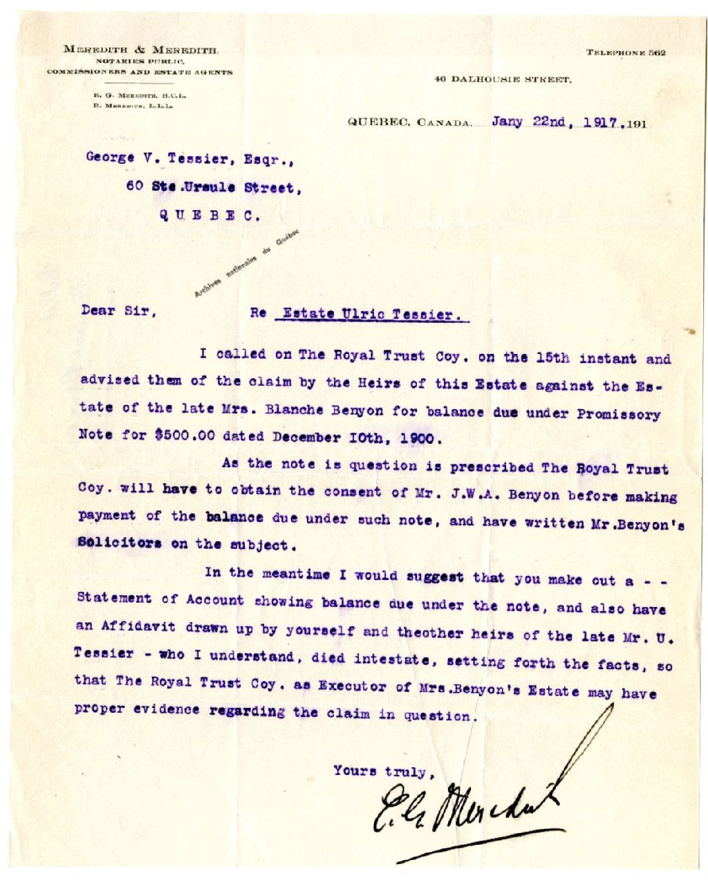 Lettre du notaire E. G. Meredith à Georges-Victor Tessier concernant un billet à ordre de Blanche Benyon, 22 janvier 1917, Archives nationales à Rimouski, Fonds Famille Tessier, (01R,P1,S7,P81).