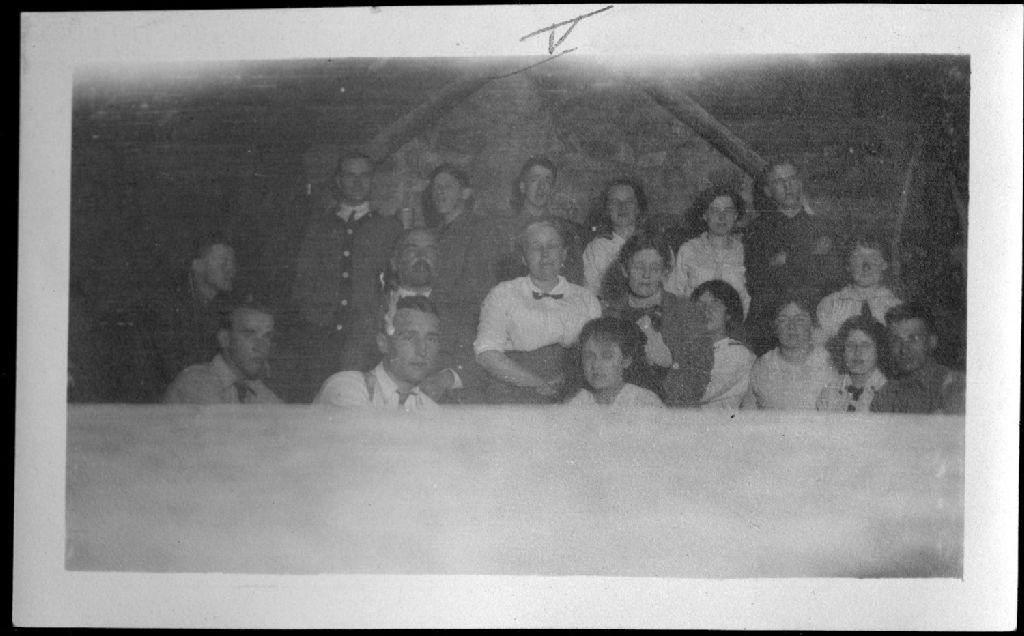 Mmes Beaulieu et Dubuc entourées de leurs enfants et amis de ceux-ci au chalet au lac des Islets, [après 1900], Archives nationales à Saguenay, Fonds Famille Dubuc, (02C,P1,D171,P43-5), Photographe non identifié.