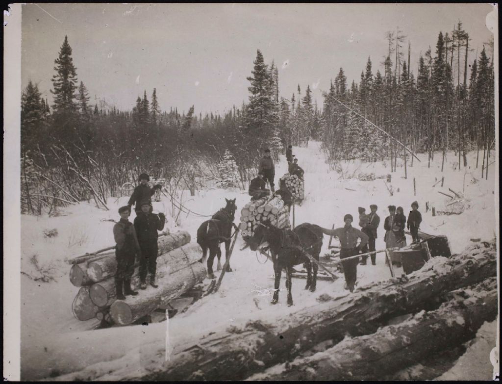 Bucherons en train de charger leur "sleigh" que des chevaux transportent