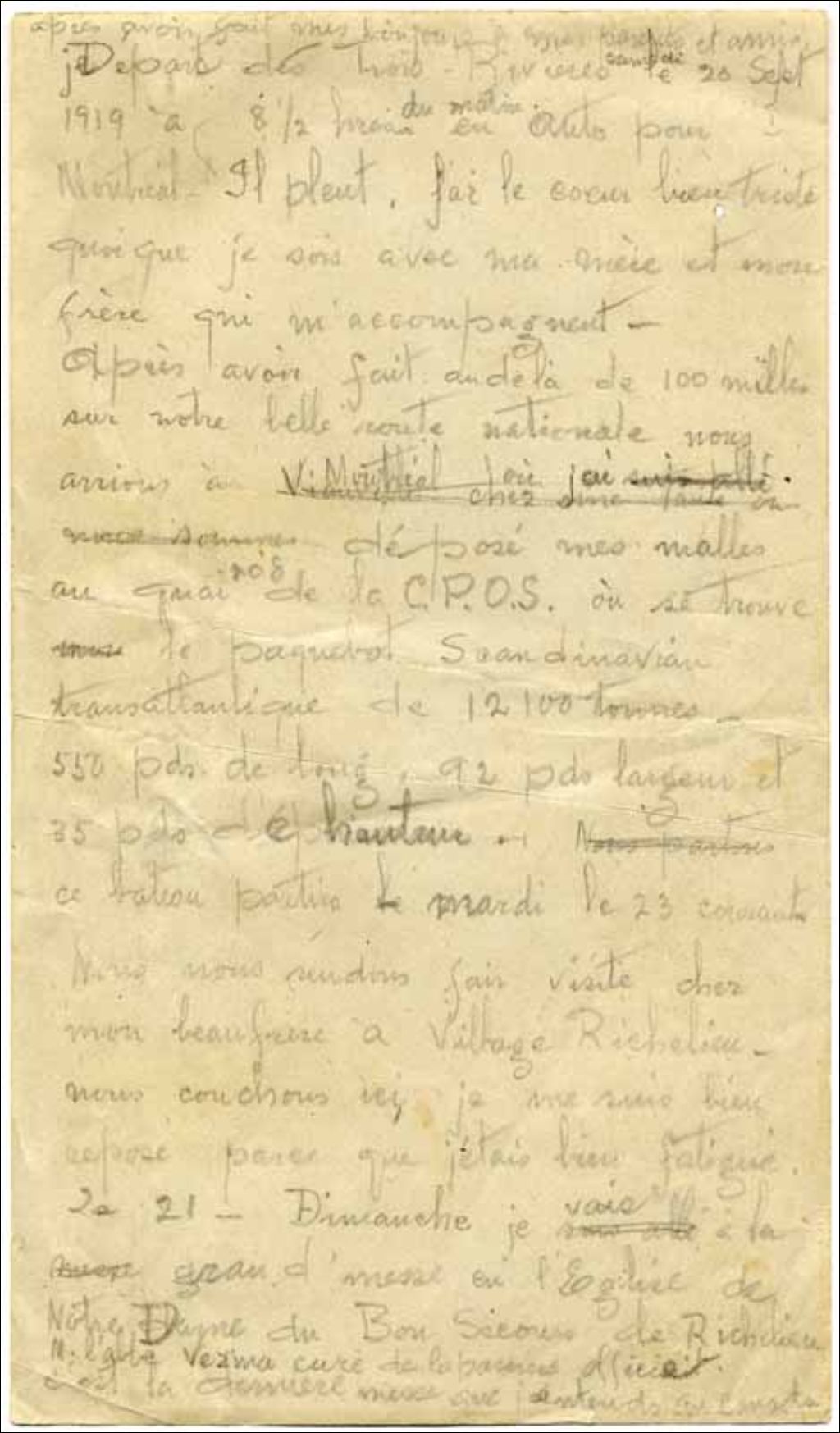 Journal de voyage d'Onésime Lamothe, 20 septembre 1919-29 novembre 1919, Archives nationales à Trois-Rivières, Fonds Onésime Lamothe, (04T,P23,S4,D1,P4).