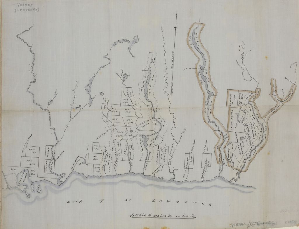 Cette carte montre les limites de concessions forestières dans la région de la Côte-nord au Québec, de Sept-Îles à la rivière St-Jean; les propriétaires en sont : N.S.P. Ry & N. Co., W.H. Davis, Campbell & Ross, S. Halligan, W. Pulling, R. Chambers