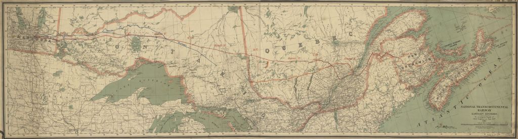Cette carte montre les tracés de chemins de fer traversant les provinces de Nouveau-Brunswick, Québec, Ontario et Manitoba; on y voit aussi les tracés des lignes de transport maritime