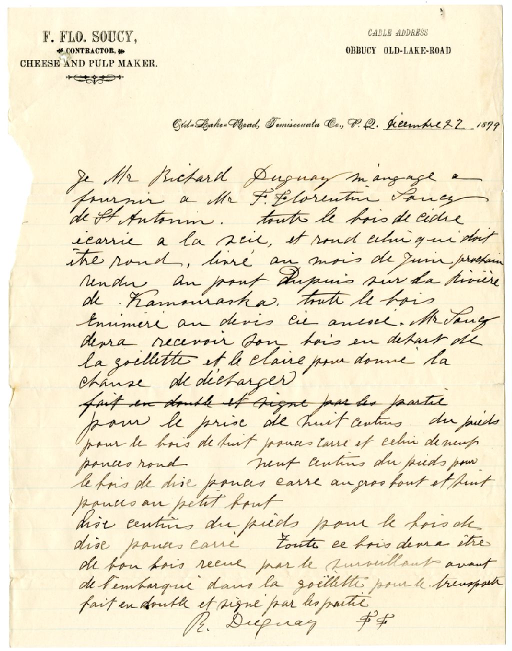 Spécifications du bois requis pour la construction du pont avec devis des quantités nécessaires. Entente entre Richard Duguay fournisseur du bois et François Soucy, 27 décembre 1879, Archives nationales à Rimouski, Fonds François Soucy, (01R,P57,D30,P2).