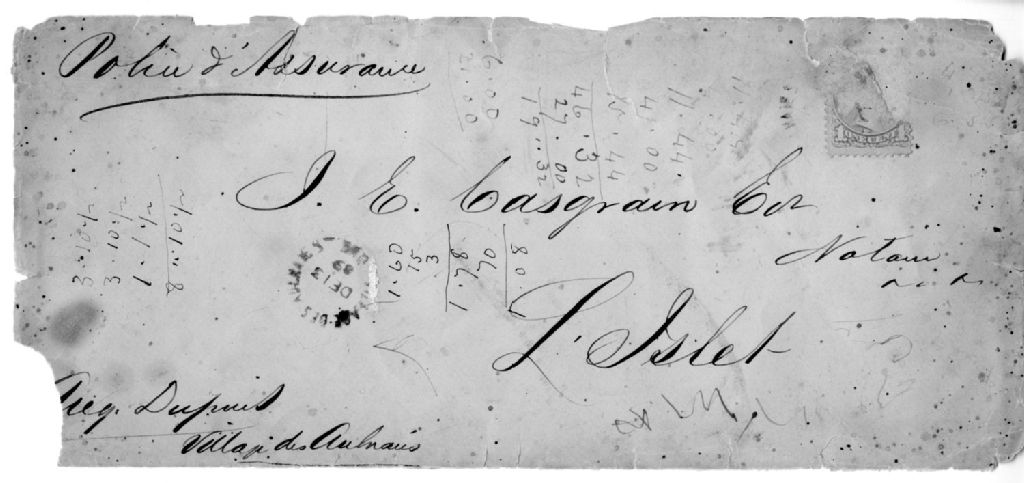 Enveloppe expédiée par un assureur nommé Aug. Dupuis du village des Aulnaies au notaire Casgrain de l'Islet, 13 décembre 1889, Archives nationales à Rimouski, Fonds Seigneurie de Bonsecours, (01R,P48,P60).