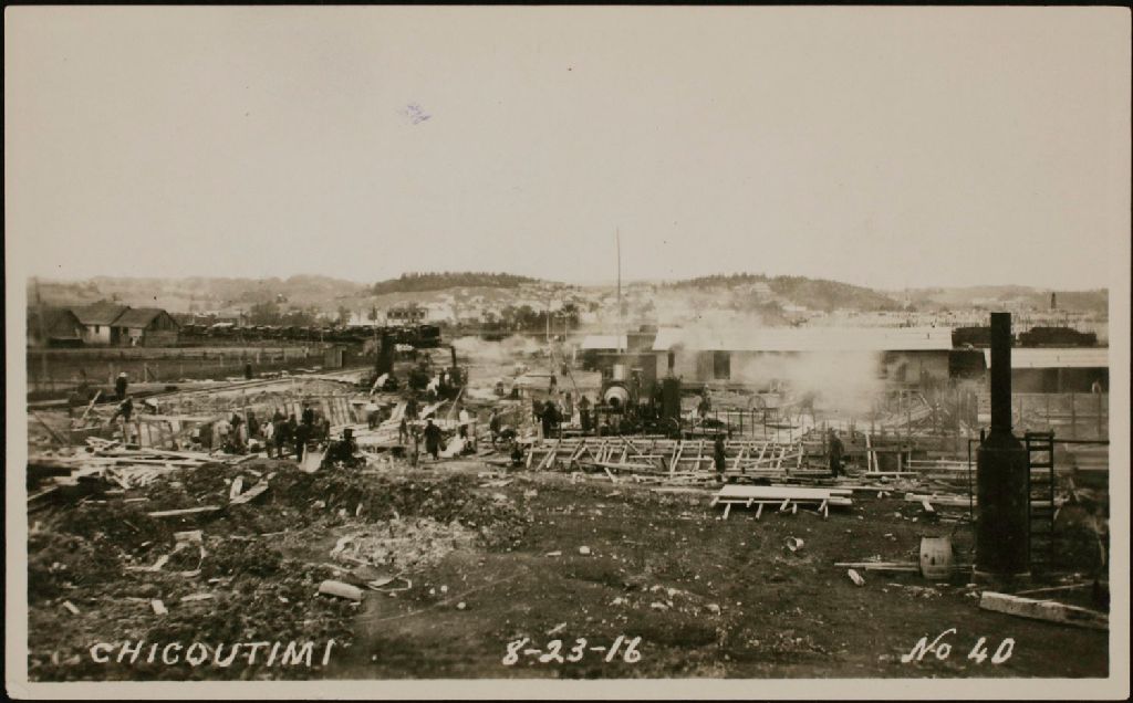 Pouring concrete in Digester foundations two mixers running also gasoline pumps. Compressor plant on right in face ground taken from « C » = Deux bétonnières versant du béton dans les fondations de la salle du condenseur