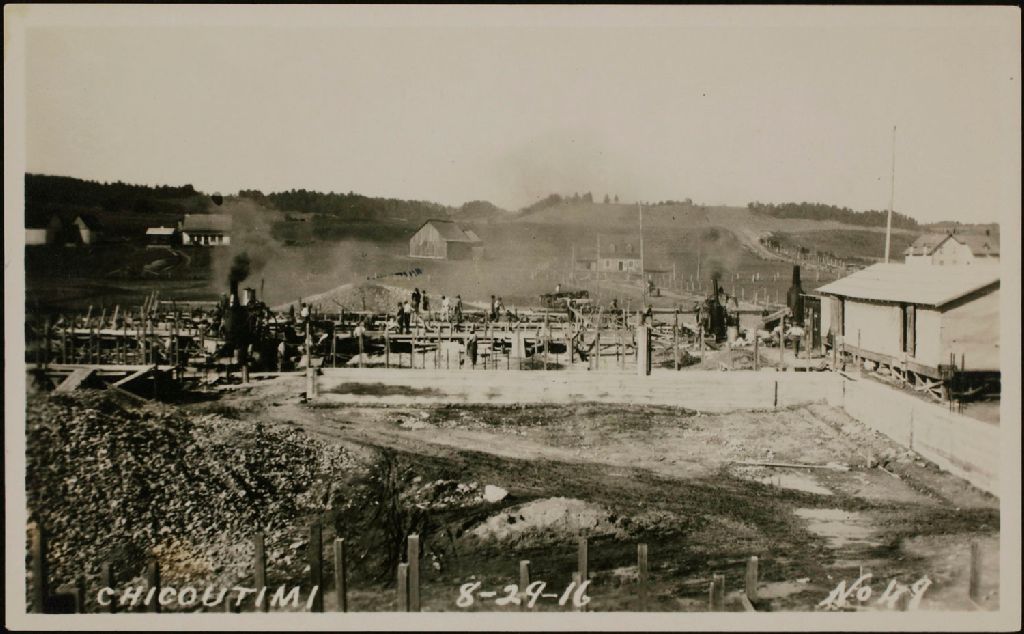 Pouring concrete in Digester wall foundation with two concrete mixers = Versement du béton dans les fondations de la salle du condneseur avec deux bétonnières