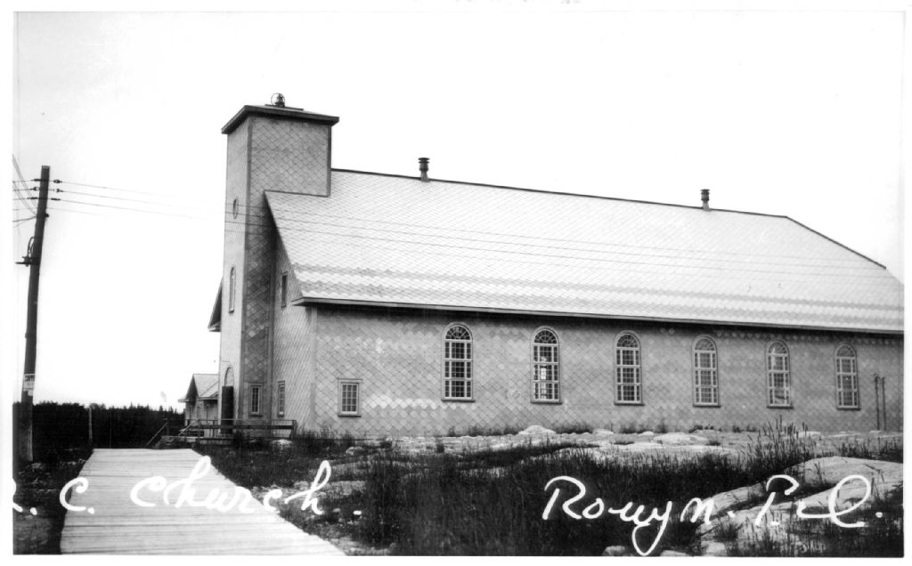 Vue du presbytère et de l'Église St-Michel sur l'avenue Du Portage à Rouyn, [vers 1927-1928], Archives nationales à Rouyn-Noranda, Fonds Fonderie Horne, (08Y,P123,S1,P170), Vavasour & Dick.