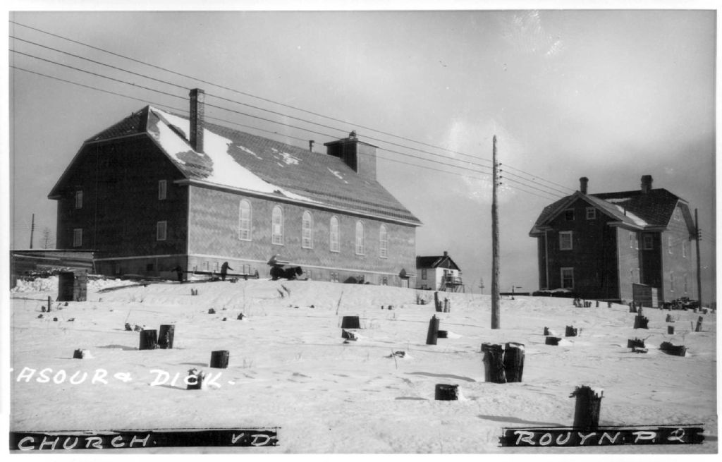 Vue du presbytère et de l'Église St-Michel sur l'avenue Du Portage à Rouyn, [vers 1927-1928], Archives nationales à Rouyn-Noranda, Fonds Fonderie Horne, (08Y,P123,S1,P171), Vavasour & Dick.